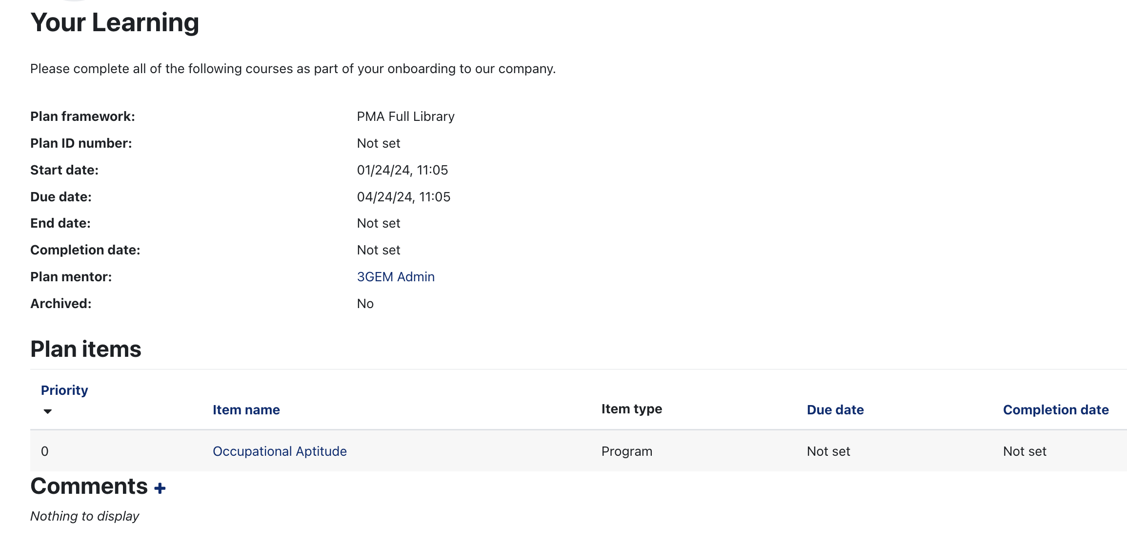 Click on a learning plan name to view the details of that plan. The plan will display, with all To Do items in the Plan items section.