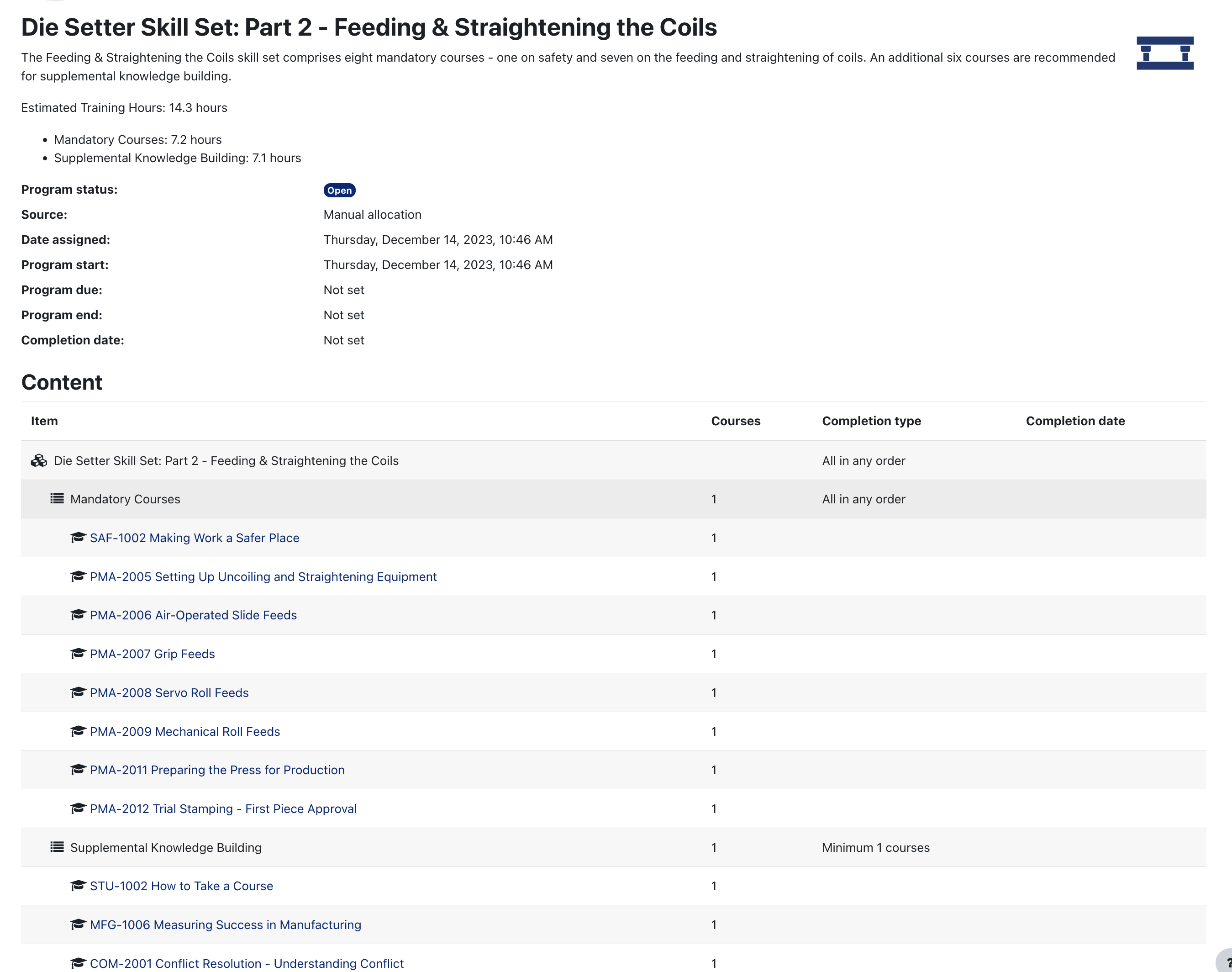 Programs are a set of courses that have been designed as a mini-curriculum. Programs can be assigned to you through a learning plan or if your supervisor has created a specific company program (e.g. press shop operator onboarding), you may be directly enrolled in the program. On the dashboard, you can see the following for each program you have been assigned: