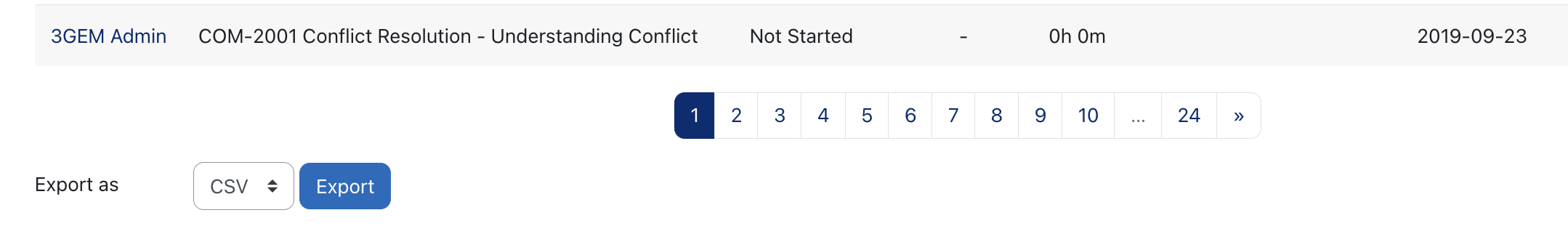Completion by Course | For each course in the system, shows: * Every learner enrolled * Their completion status * The date they were enrolled * The date they started the course * The date they completed the course * Their grade |